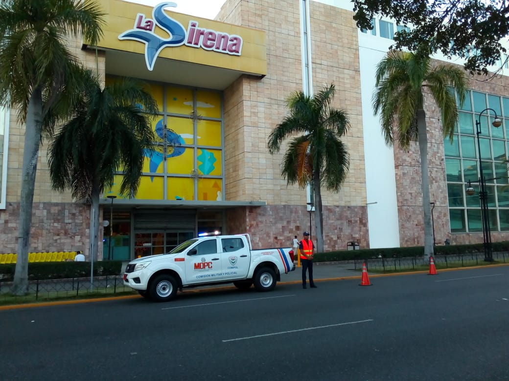 El personal de COMIPOL está brindando seguridad en las plazas comerciales y los corredores viales del Gran Santo Domingo son reforzadas para garantizar la seguridad ciudadana.