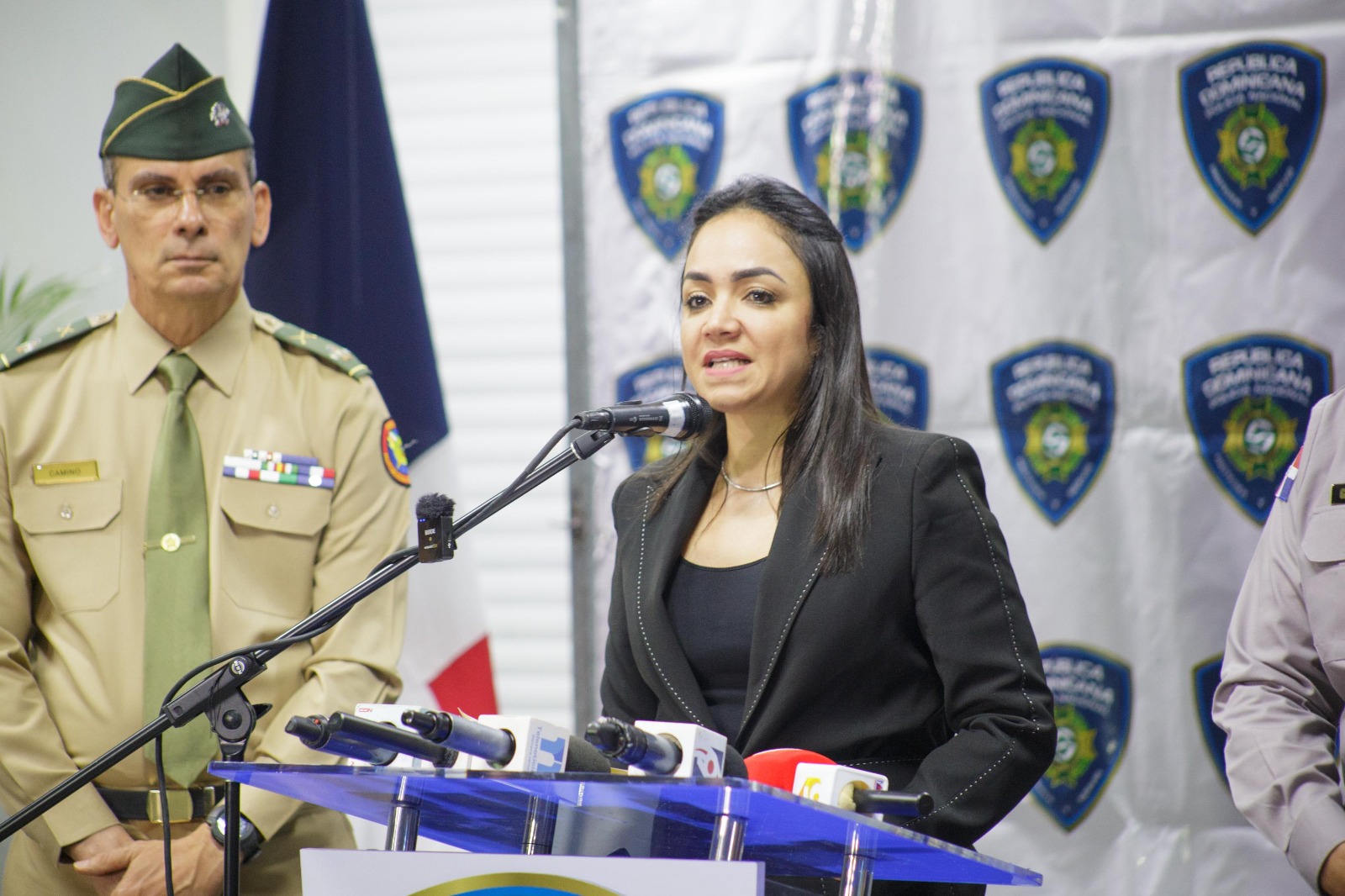 Acompañaron a la ministra en el encuentro con la prensa el director del cuerpo del orden, general Ramón Antonio Guzmán Peralta, y el comandante de la Fuerza Aérea, Floreal Tarcido Suárez Martínez.
