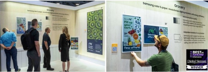 Presentando recientemente en InfoComm 2024, Samsung Color e-Paper, es una nueva solución de señalización digital, que combina a la perfección la tinta digital con la innovadora tecnología de papel electrónico a todo color, y puede reemplazar los materiales promocionales analógicos o de papel.