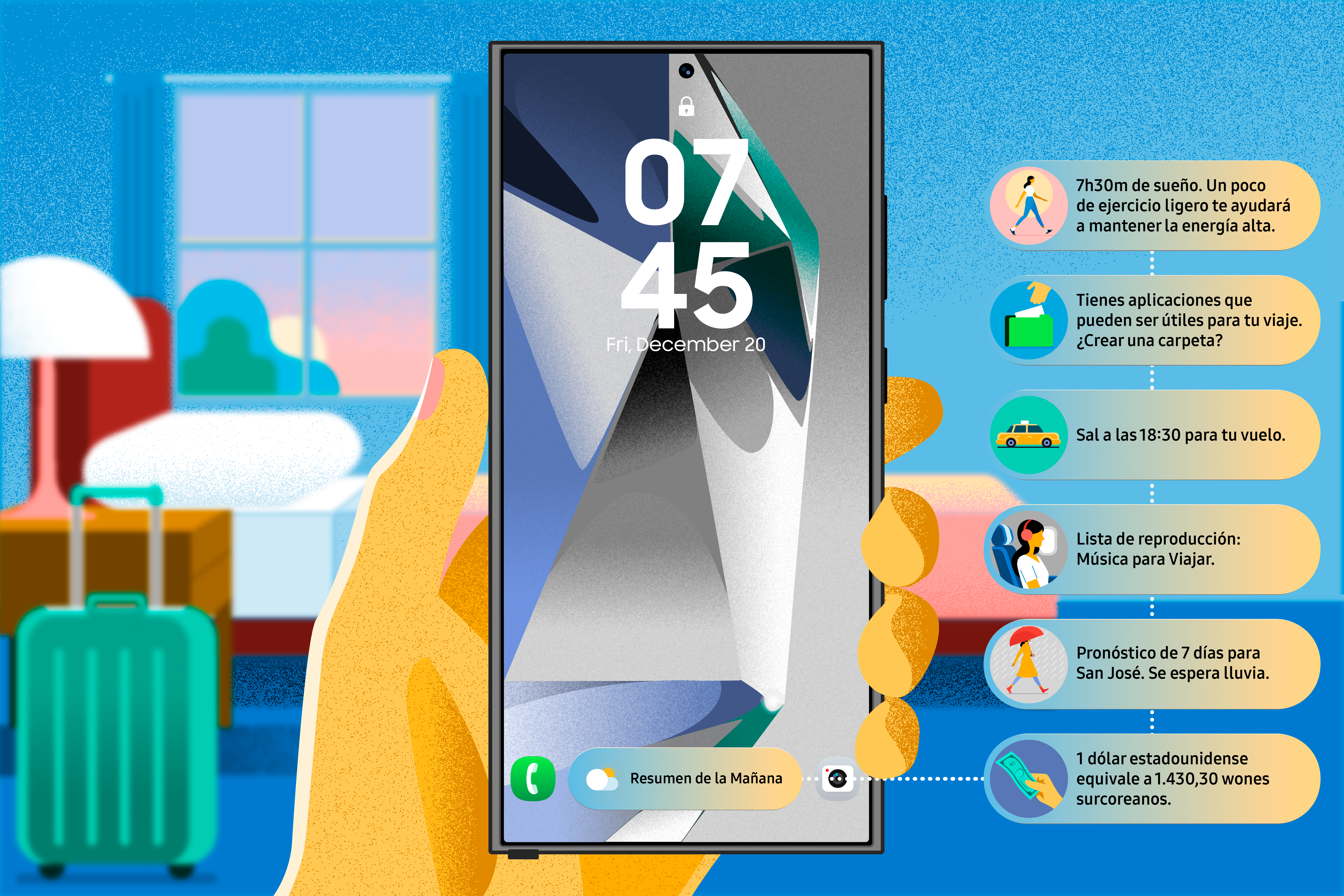 Galaxy AI lleva la experiencia móvil más allá, anticipándose a las necesidades del usuario. Desde consejos prácticos al inicio del día hasta recomendaciones nocturnas, cada interacción está diseñada para inspirar y simplificar la vida cotidiana.