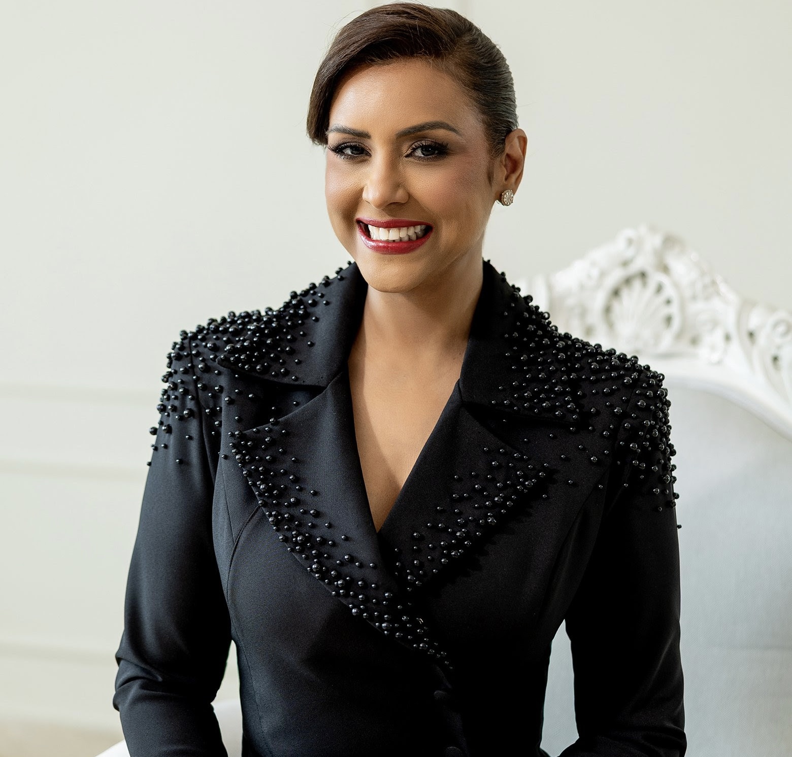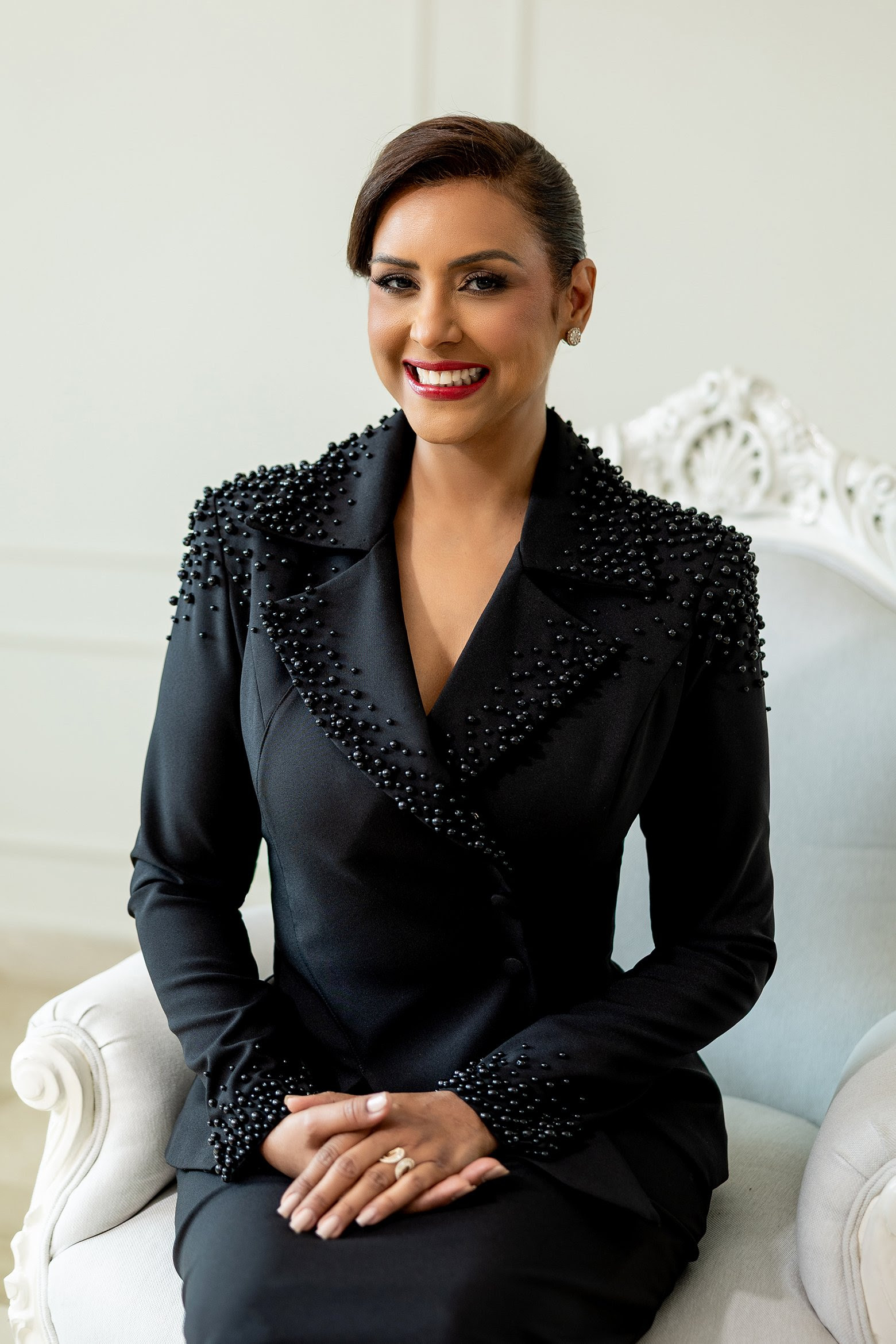 Para la ocasión, Méndez confió en la casa de modas Bride to Be, luciendo un exclusivo diseño de Suzelle Taveras, bajo la dirección del reconocido estilista Sócrates McKinney. El atuendo elegido, un traje corte sastre de dos piezas con falda en tono negro, se distingue por su delicado tejido y bordado a mano con cientos de perlas negras, un detalle que refuerza la solemnidad del evento sin perder el sello de feminidad que caracteriza a la legisladora.