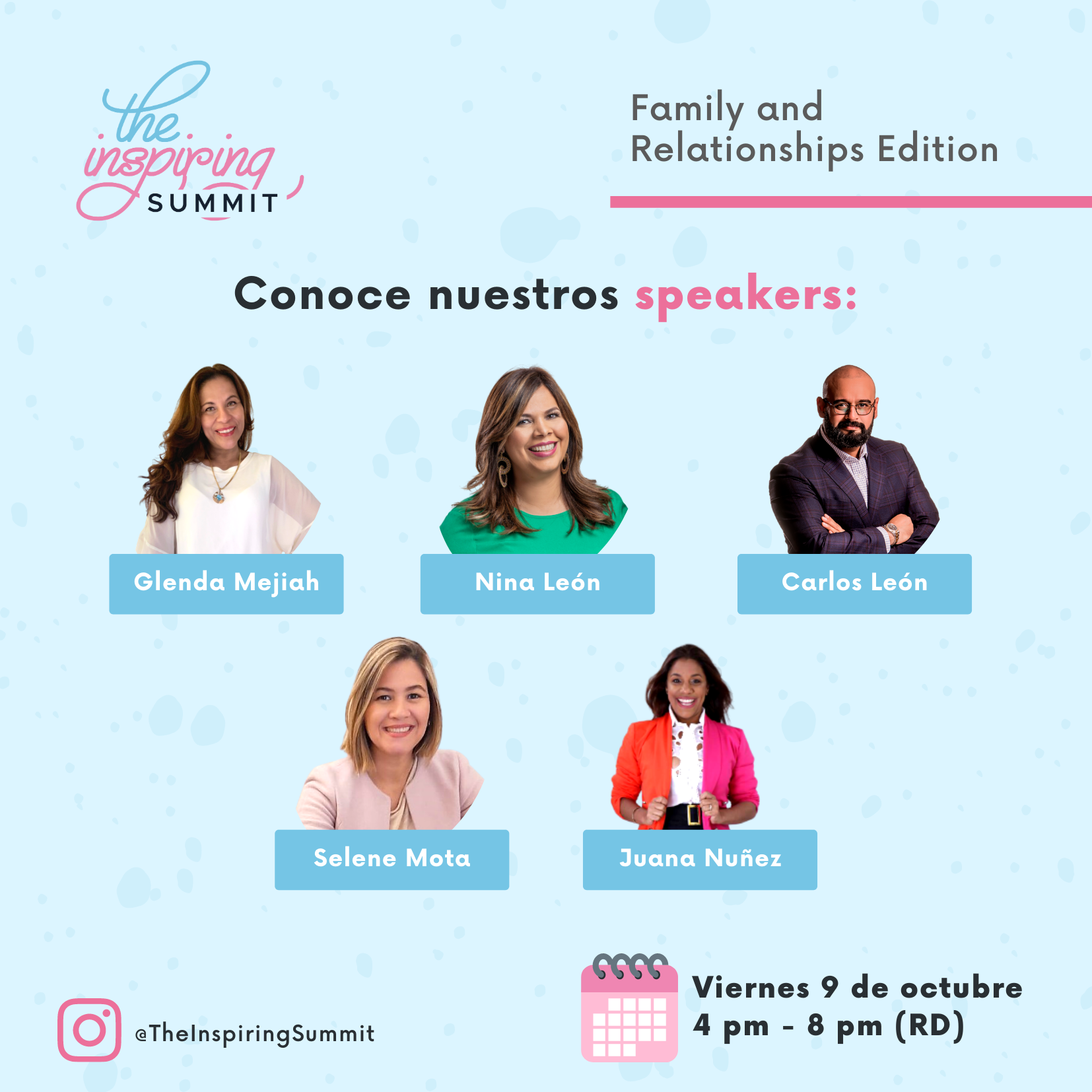 En esta segunda edición contaremos con la participación de las afamadas speakers: Selene Mota, Pastora Nina León, Pastor Carlos León, Juana Núñez y Glenda Mejiah.