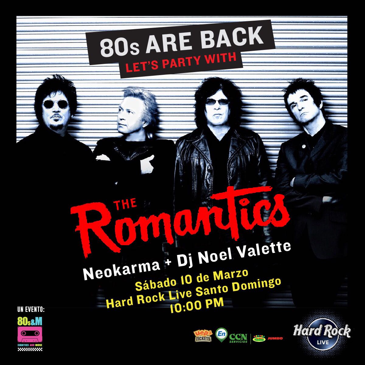 Las boletas para disfrutar esta experiencia inolvidable del concierto de The Romantics en Hard Rock Live Blue Mall, están disponibles en Uepa Tickets CCN Jumbo Supermercados Nacional.