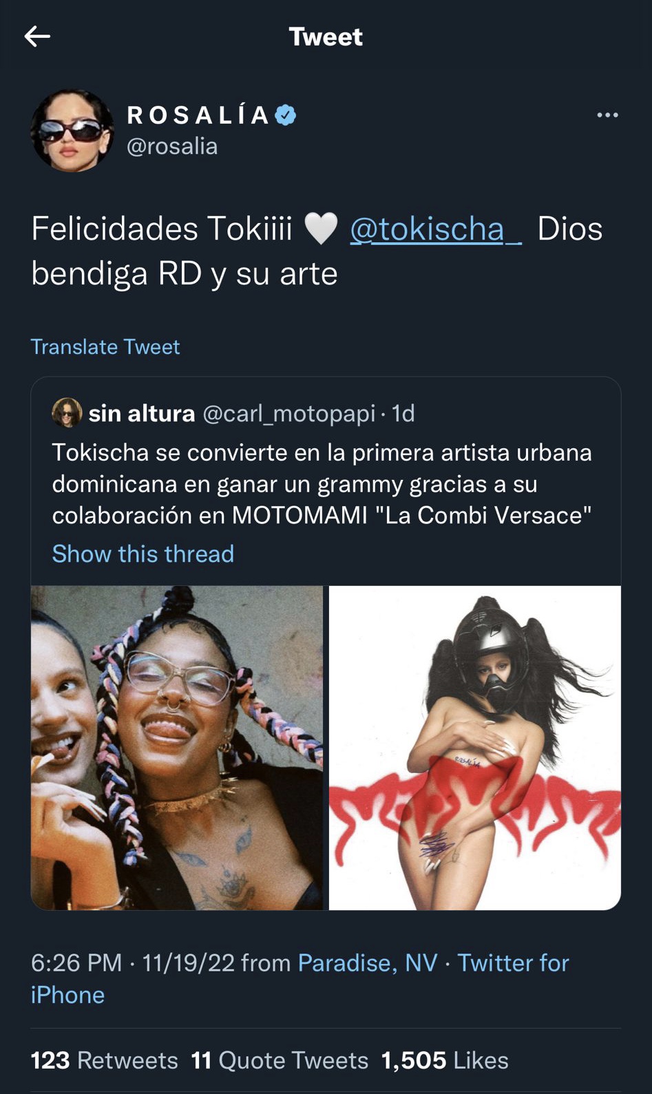 Por su parte, Rosalía, tras darse a conocer en Twitter que Tokischa sería la primera artista urbana dominicana en ganar un Latín Grammy agregó lo siguiente en un Twit; “Felicidades Tokiiii @Tokischa Dios bendiga RD y su arte”.