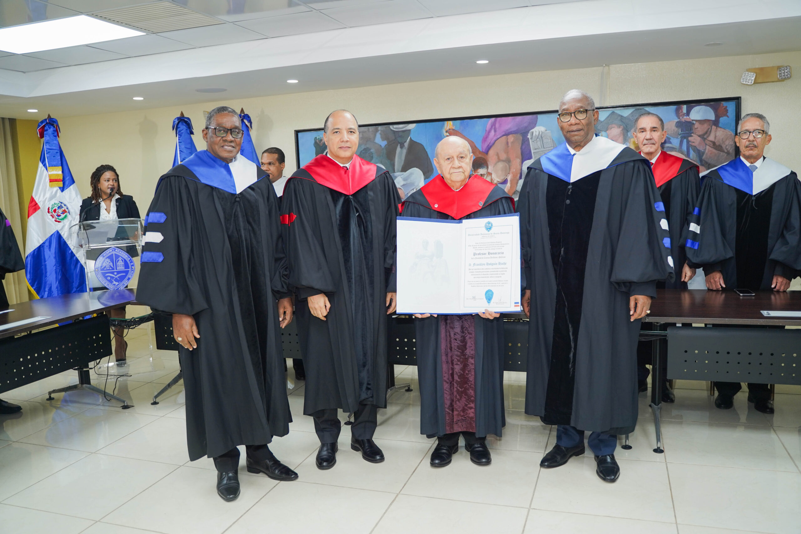 La Universidad Autónoma de Santo Domingo (UASD) otorgó el título de Profesor Honorario al Dr. Franklyn Holguín Haché, rector de la Universidad APEC (Unapec), en un emotivo acto celebrado en el salón del Consejo Universitario. Este reconocimiento destaca su incansable contribución al fortalecimiento de la educación superior en la República Dominicana, su trayectoria profesional y su compromiso con la justicia y la equidad social.