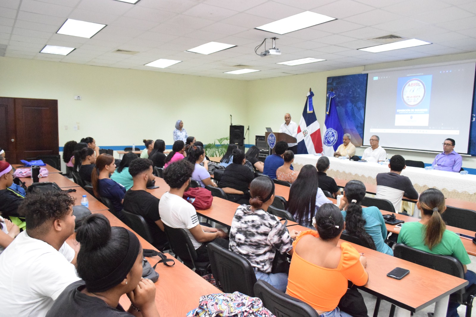 La mesa principal estaba encabezada por el Rafael Veras Granados, Subdirector Administrativo del Recinto, en representación del Director General, maestro Juan Arias Fuentes, el maestro Genaro Peña Fernández, quien ofreció una disertación titulada “Abril: 60 años de la gesta histórica”, el maestro José Gilberto Rodríguez, Coordinador de la Unidad de Cursos Optativos a tesis, los maestros, Santiago Gil, Anthony Almonte y la maestra Lucia Cabarallo, quien pertenece a la comisión de efemérides y fungió de maestra de ceremonia.