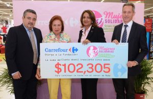 la Asociación Mujeres Solidarias Los ejecutivos del Hipermercados Carrefour hicieron entrega de una donación a representantes de la Asociación Mujeres Solidarias, correspondiente a los fondos recaudados en la tarde de Zumba por un “Sí a la Vida”, organizada con el propósito de dar apoyo a mujeres diagnosticadas y sobrevivientes de cáncer de mama. El cheque por valor de RD$ 102,305. pesos fue entregado por Olivier Pellin y Gerardo García a las señoras Luisa Ramírez e Yderma Arias de AMSI, quienes expresaron su agradecimiento por la iniciativa de Responsabilidad Social de Carrefour, que contribuye a dar apoyo a sectores desprotegidos. Zumba por un “Sí a la Vida”, es evento pro-recaudación de fondos a beneficio de la hermosa labor de sensibilización y apoyo a mujeres sobrevivientes y padecientes que realiza la Asociación Mujeres Solidarias Incorporadas (AMSI), dentro de las actividades de la celebración del Décimo Cuarto aniversario de su fundación. AMSI es una institución sin fines de lucro creada para brindar apoyo emocional y económico a mujeres de escasos recursos diagnosticadas y sobrevivientes de cáncer de mama “A propósito de que el 19 octubre se conmemoró el mes de la Lucha contra el Cáncer, los ejecutivos de Carrefour hemos querido unirnos a la causa de la mejor manera que podemos. De ahí que organizamos esta actividad para recaudar fondos que serán destinados 100% a la hermosa labor que realiza la Asociación de Mujeres Solidarias”, destacó el Sr. Gerardo García, director de operaciones de Hipermercados Carrefour.