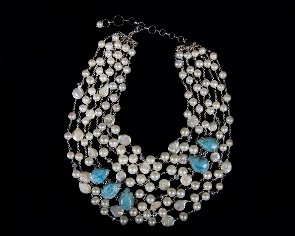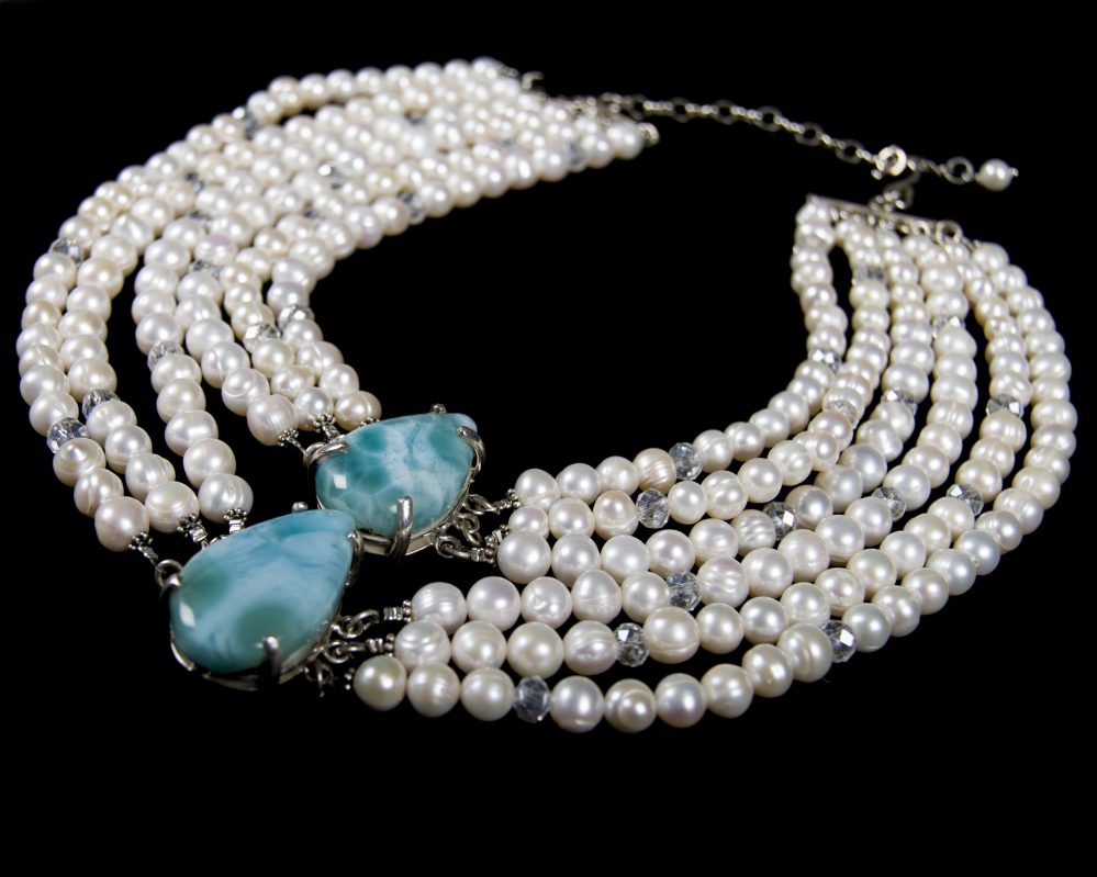 “El larimar con su atractivo color turquesa, su dureza, así como el pulido y brillo que se le pueden dar, hacen que sea un excelente material para mis creaciones”, dice Gisselle Mancebo, quien hace combinaciones con perlas, plata y oro.