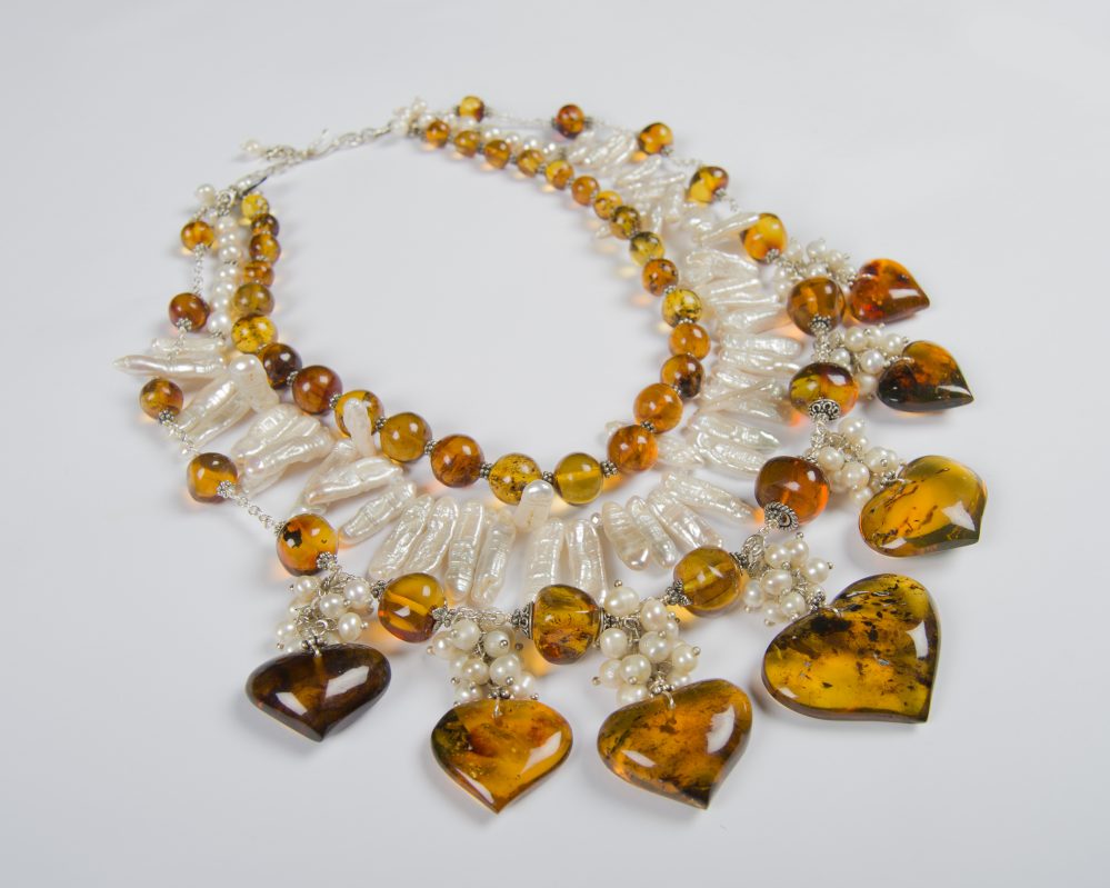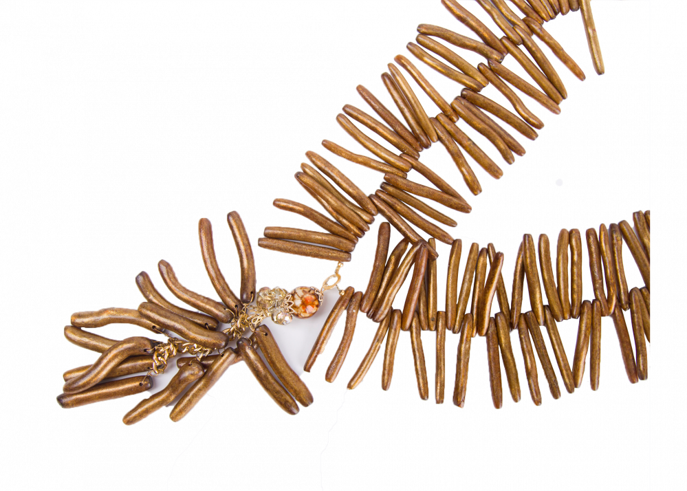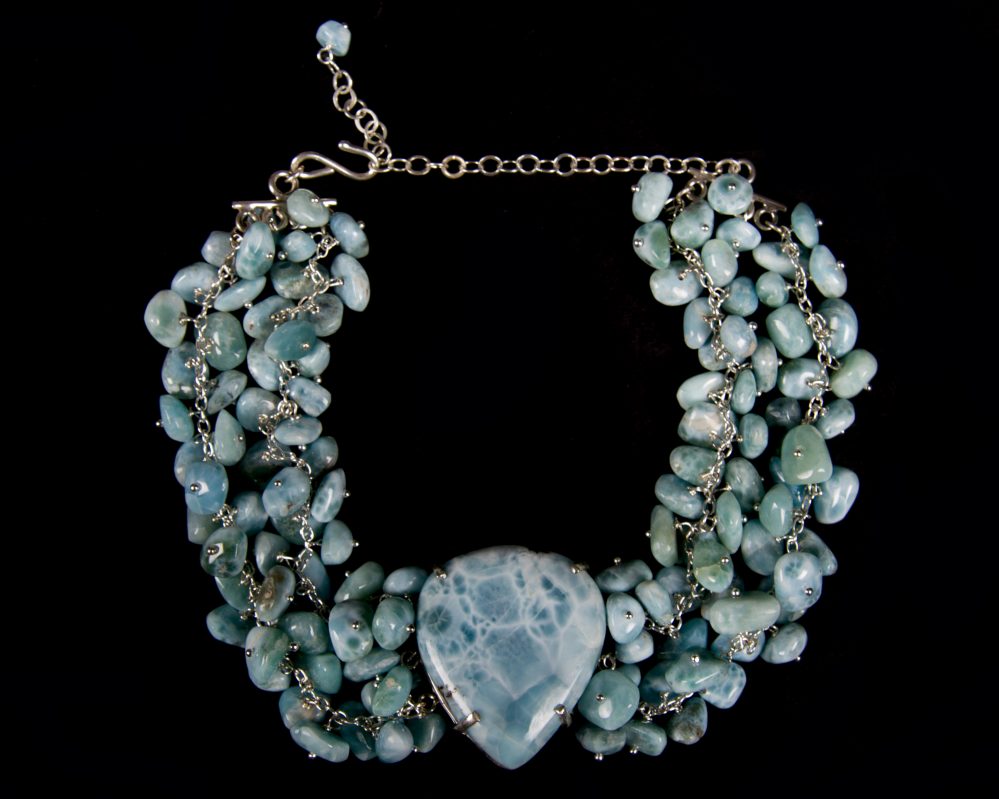 La artista hace un homenaje a su tierra, Barahona, mostrando espectaculares creaciones de collares trabajados con piedras como el larimar, onyx, coral, ámbar, amatista, entre otras, imprimiendo un sello arquitectónico en cada pieza.