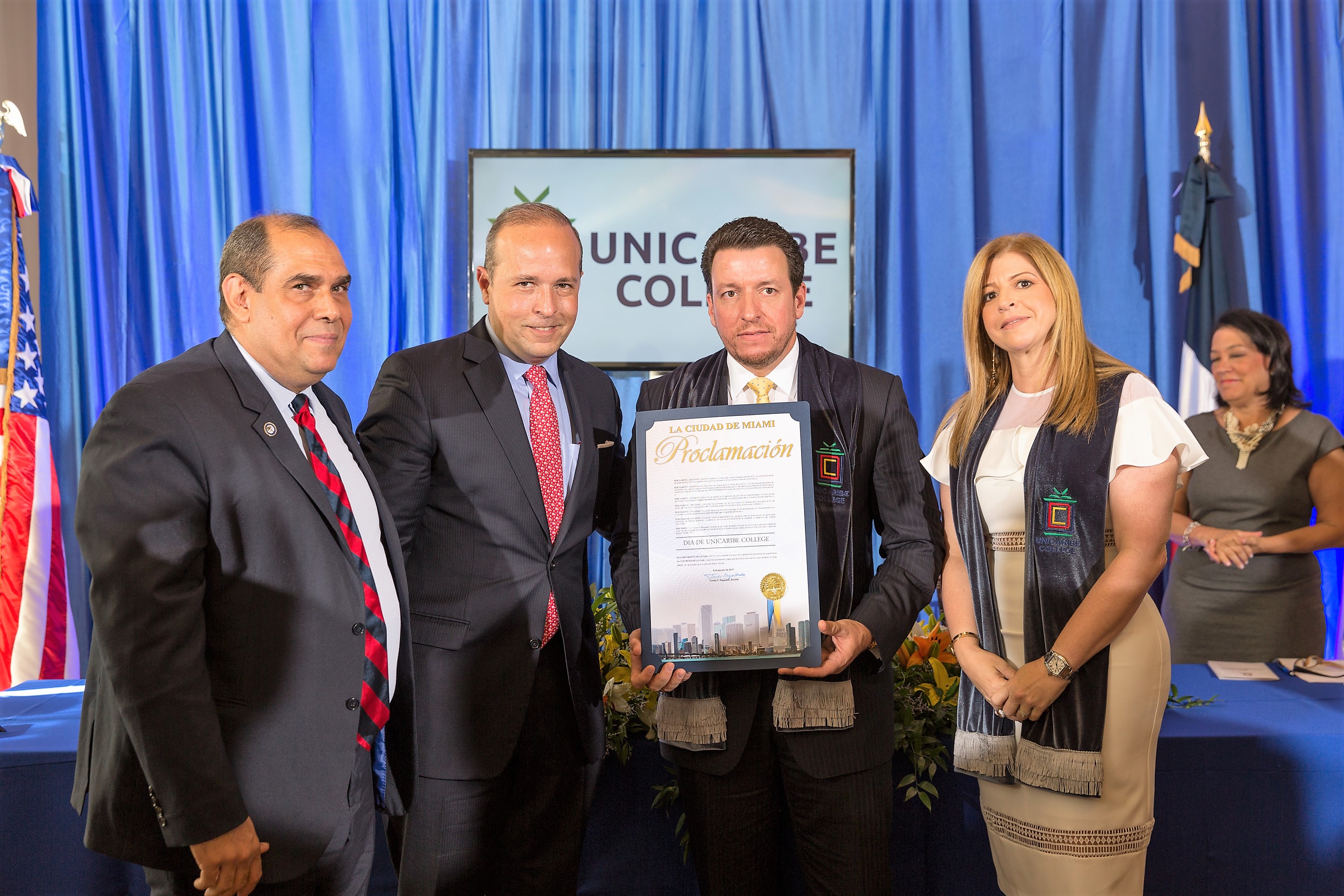 La Representante Estatal Daisy Báez y la Ciudad de Miami de la mano de Tomas Regalado hijo y José Ramón Álvarez, entregaron una proclama que declara el 9 de Agosto del 2017, el Día de UNICARIBE COLLEGE, la cual recibió el Presidente del Consejo José Alejandro Aybar.