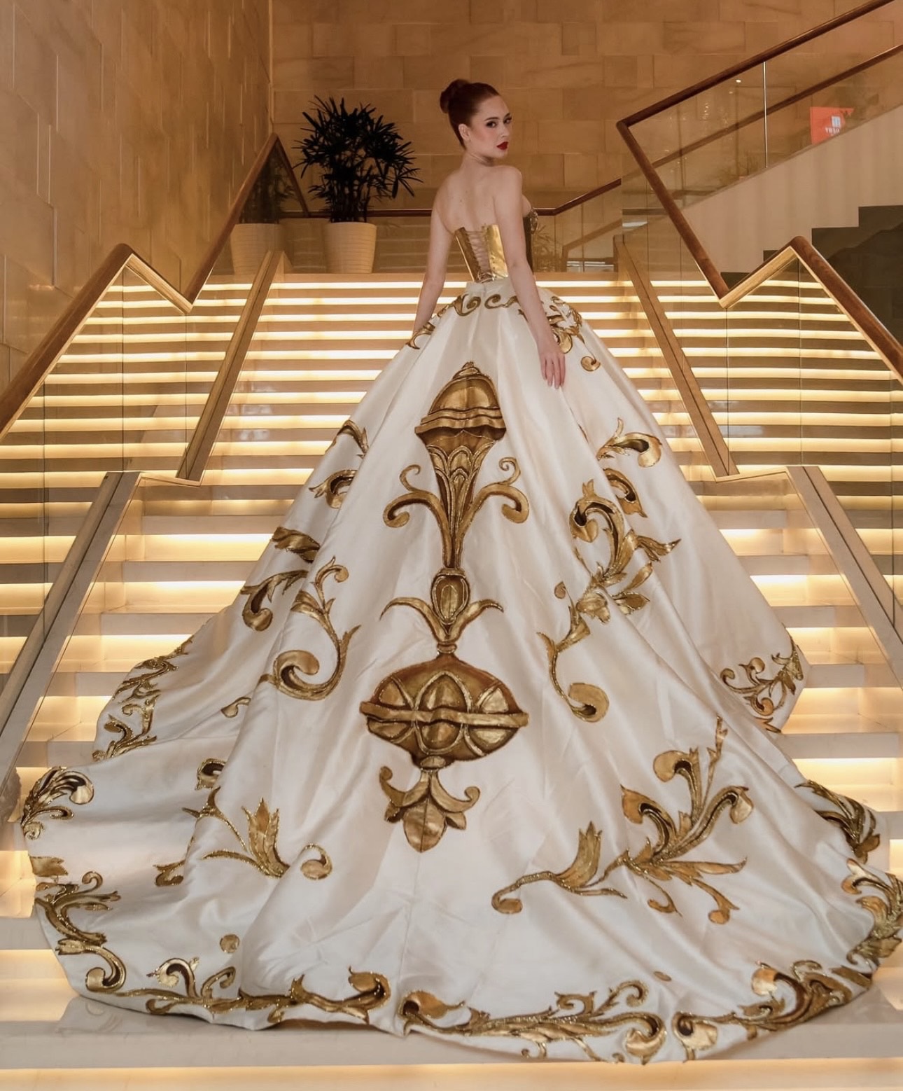 El traje, de alta costura y acabado artesanal, fue pintado a mano por el artista visual Yan Páez y adornado con orfebrería de la colombiana Diana Herrera. La confección incluyó pan de oro sobre un delicado lienzo de ciberlina de seda blanca, con incrustaciones de cristales Swarovski, dando vida a una figura inspirada en un ángel, símbolo de luz, fuerza y espiritualidad.