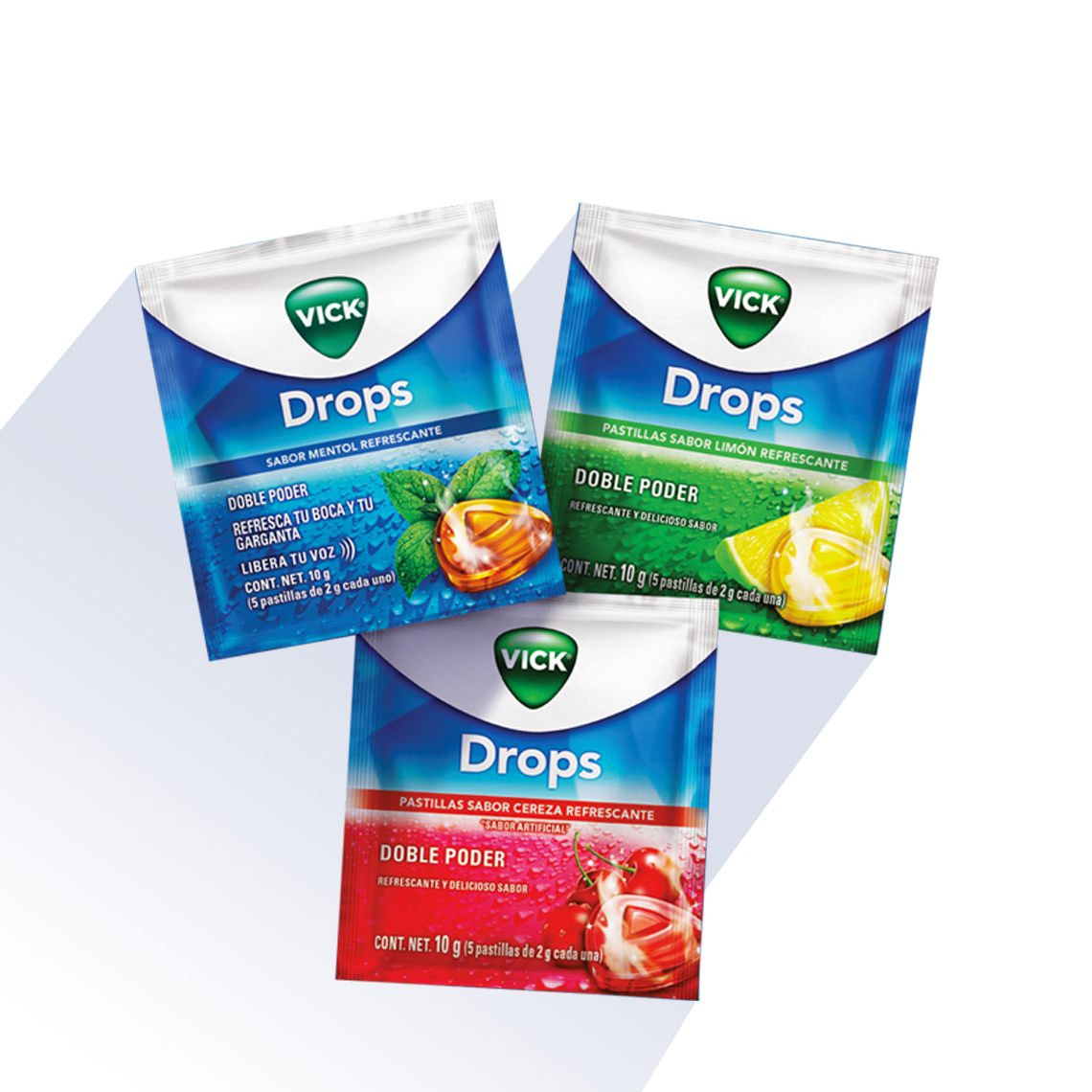 Estos caramelos sólidos, están diseñados para proporcionar una sensación de enfriamiento en el tracto respiratorio, gracias a su fórmula que contiene una unión entre el mentol y el alcanfor, los cuales liberan una sensación de frescura y bienestar, aliviando los molestos síntomas del resfriado común, como la congestión nasal y la tos. Los “VICK Drops” vienen en tres deliciosos sabores, limón, cereza y mentol.