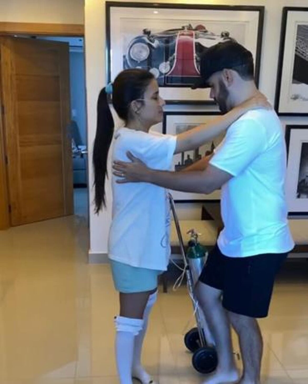 En un video que publicó en sus redes sociales se ve a la bailarina acompañada del artista ayudándola a dar pasos por su casa con un tanque de oxígeno.